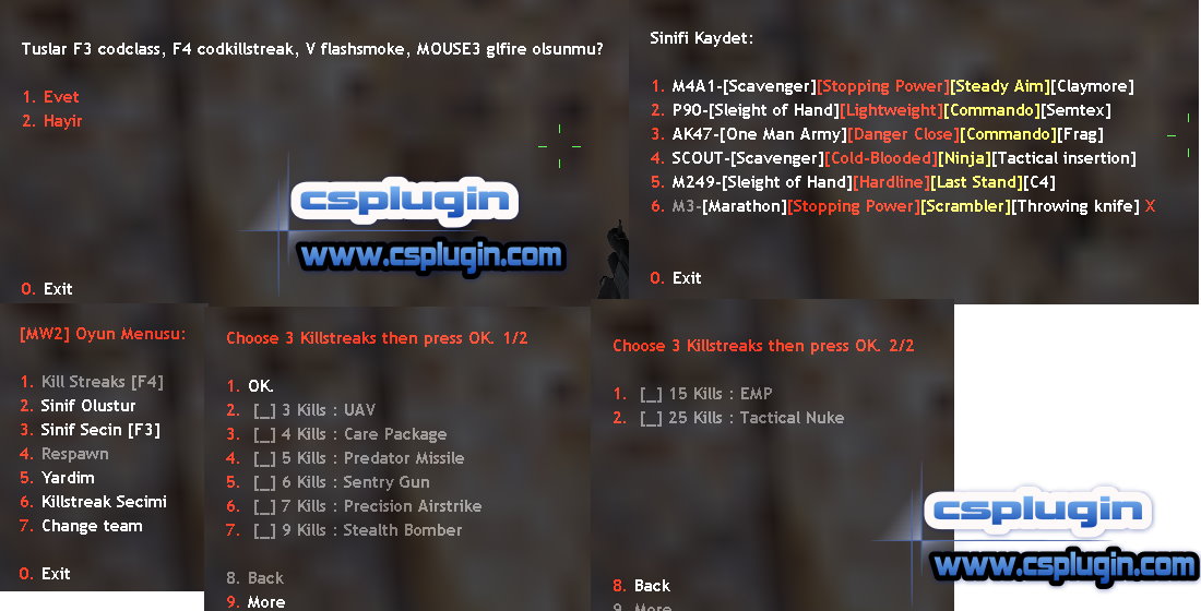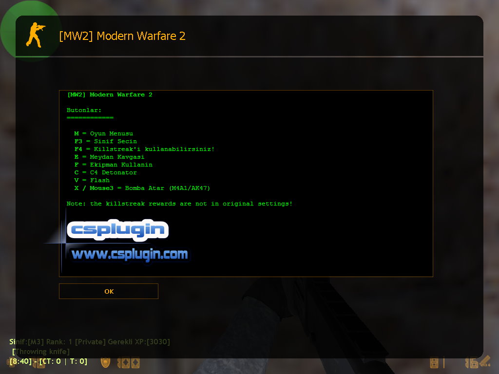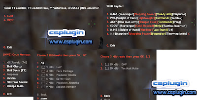Modun dil dosyası türkçe. Daha önce türkçeye çeviren olmuş. Oyun sırasında killstrike seçimine göre çeşitli ödüller kazanıyorsunuz. Çektiğim video da ben sentry guns seçtim. 6 adam vurduğum zaman otomatikmen ödülünüzü veriyor.Ödül listesinin başlarında 3 4 5 6 rakamları vuracağınız adam sayısını ifade ediyor. Not: Botlarla test ettiğimden bıçaklı oynamalarını seçtim. O yüzden bana ateş etmiyorlardı.